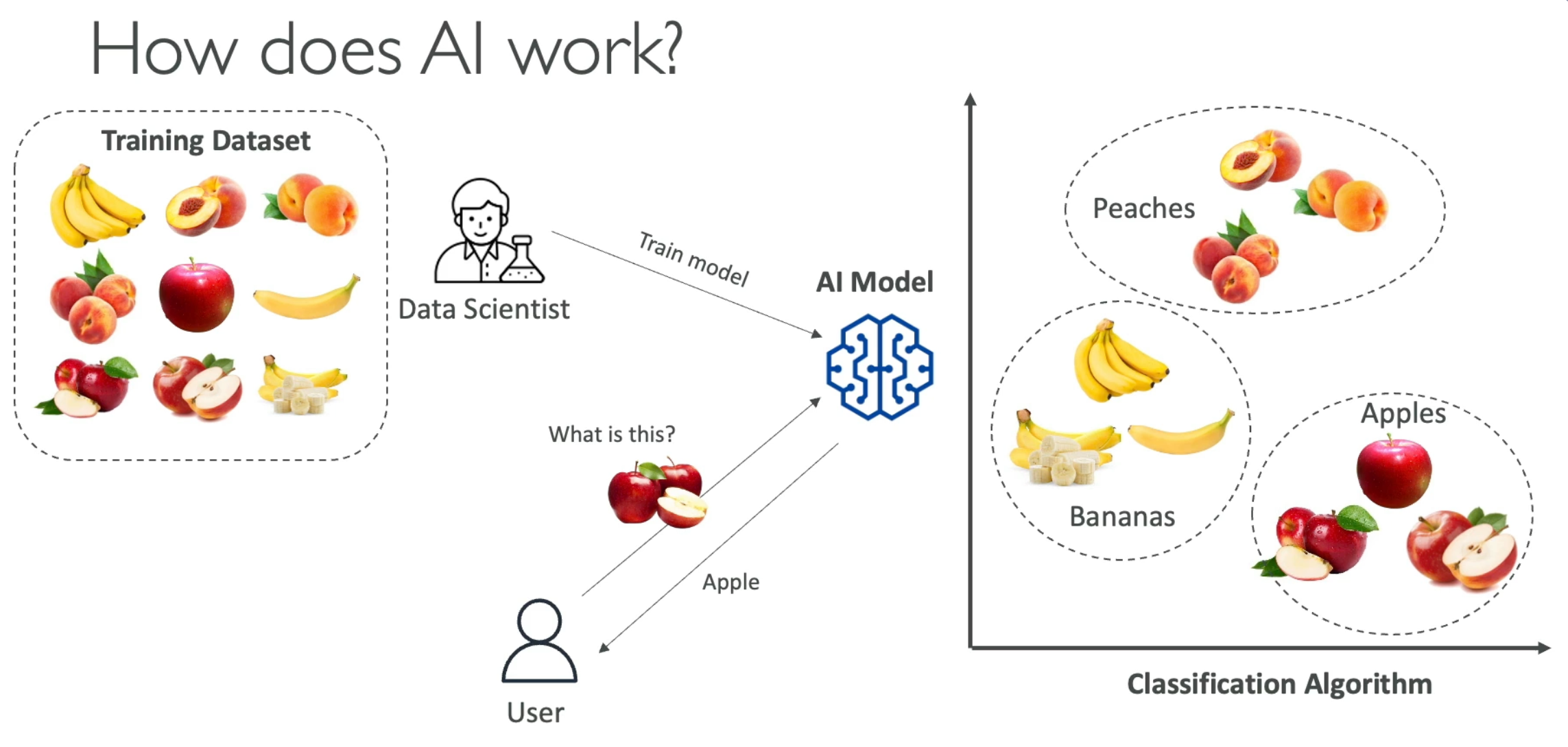 A basic example of an AI model could be a fruit classification algorithm trained on a large dataset of labeled fruit images. A user can then input a new image, and the model would classify what type of fruit it is, even without having seen that exact image before.