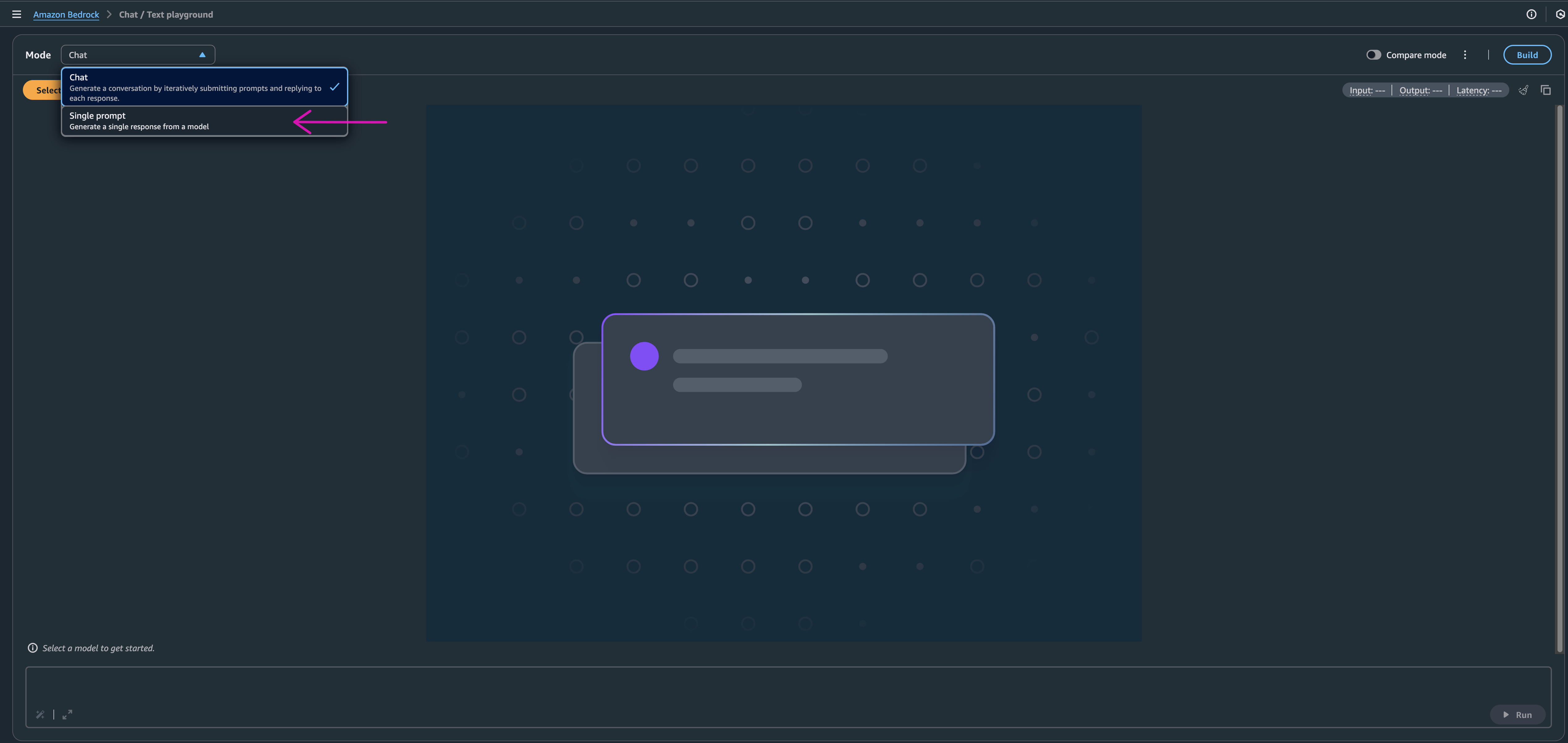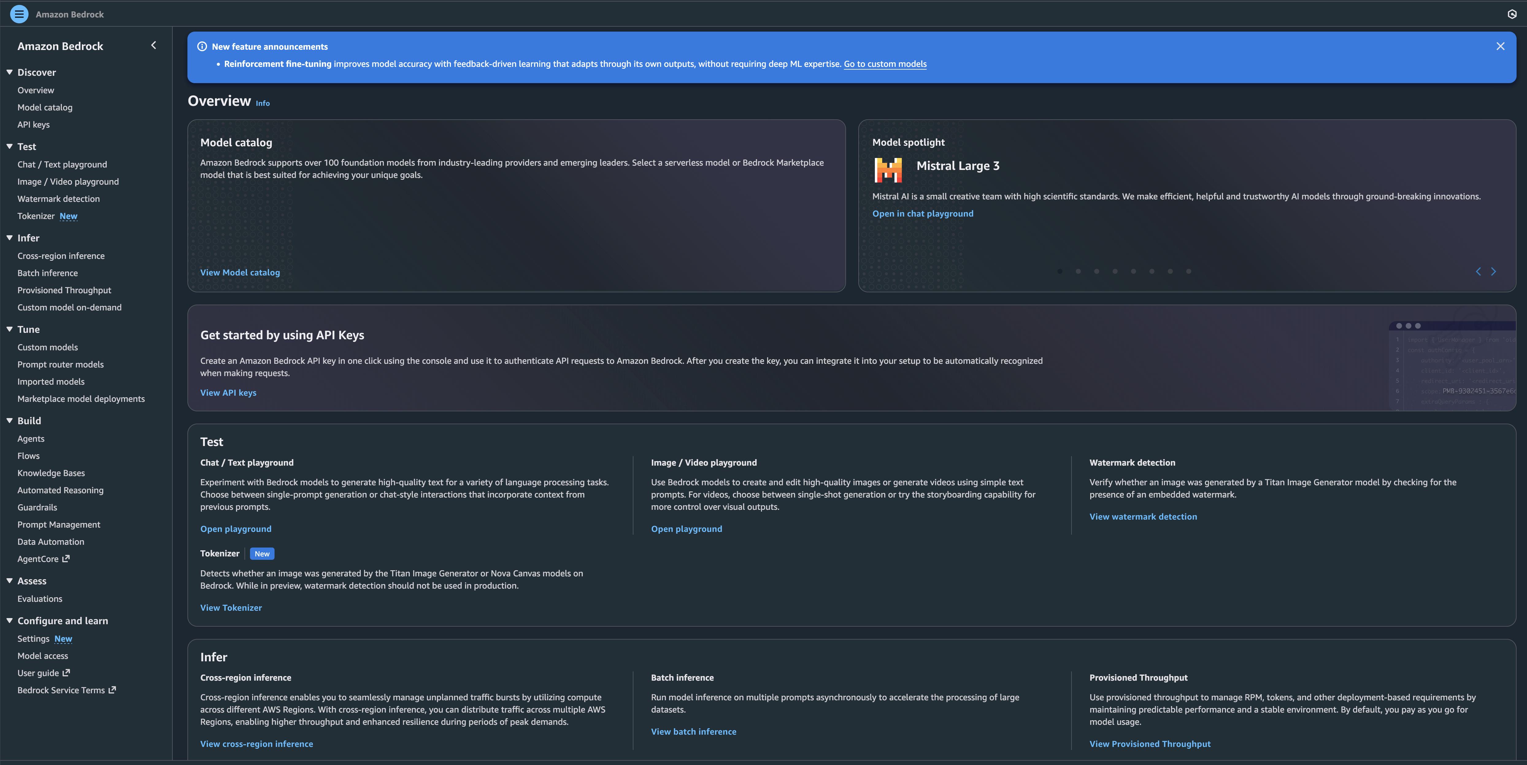 - I was able to experiment with Amazon Bedrock’s basic functions for testing text and image generation models, as well as see the number of foundational models it offers from various providers.