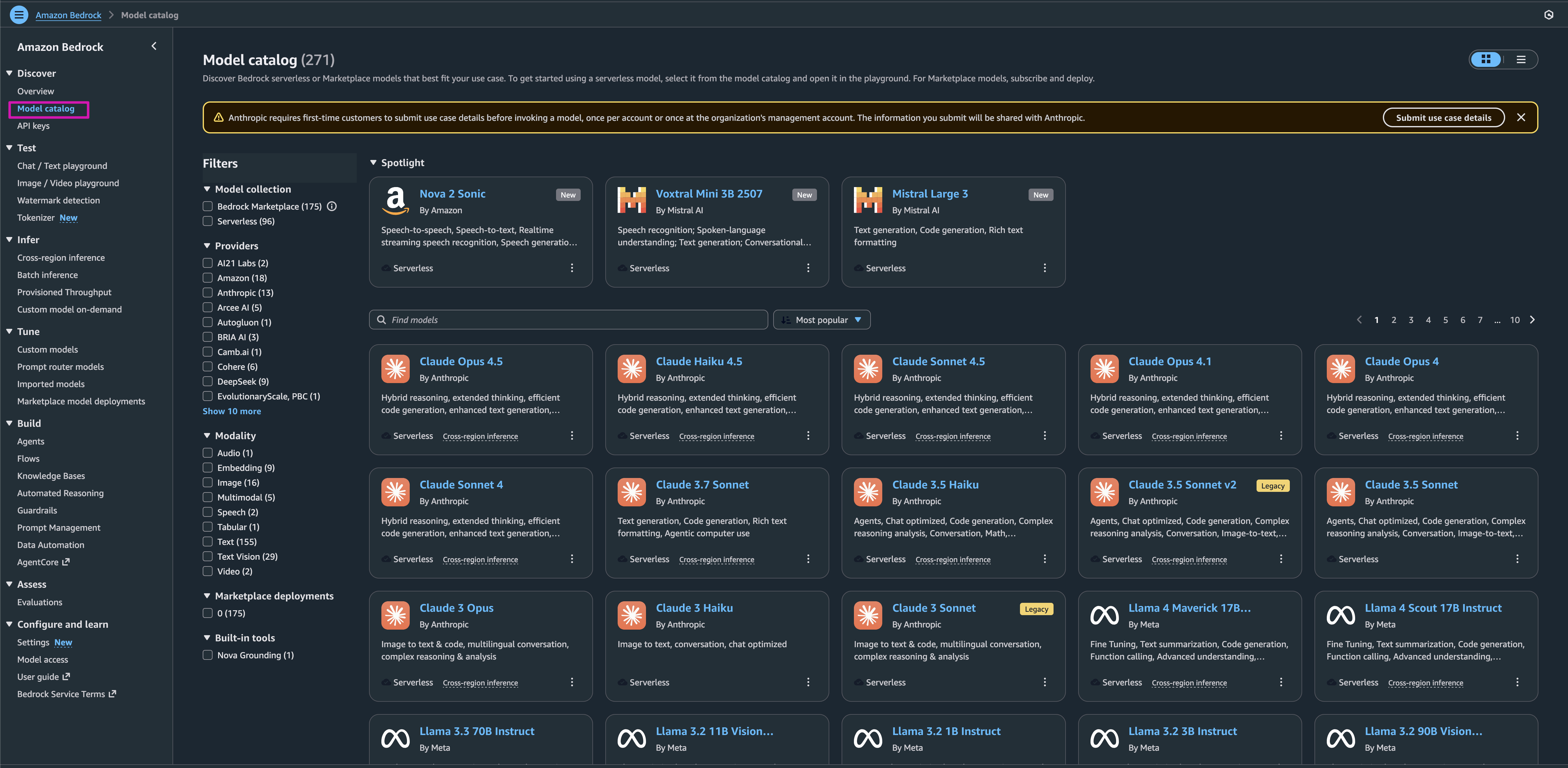 - In the Amazon Bedrock console, I looked for Model Catalog, here is where you can see all the Foundation Models available in Bedrock, classified by Provider, Modality, among others.