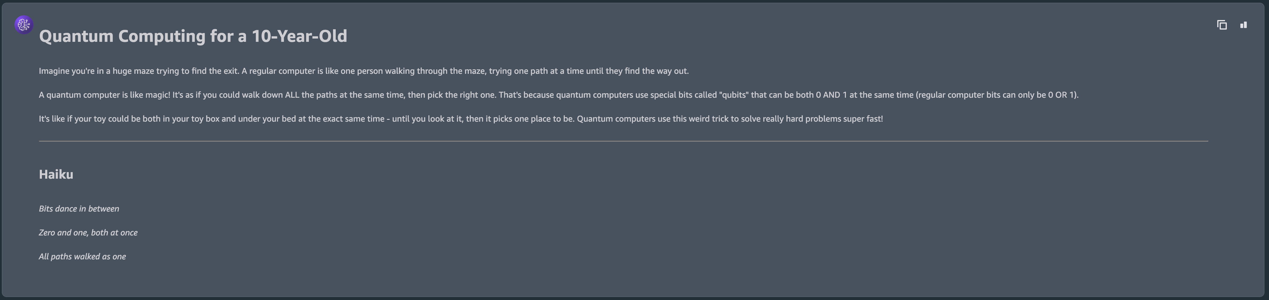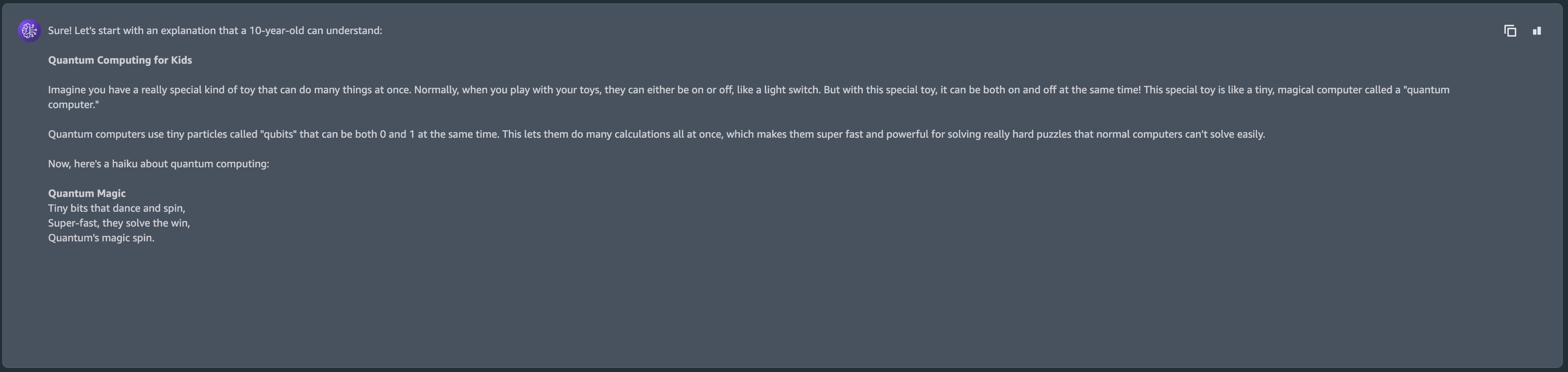 - Leaving all the default settings, I wrote the following prompt: “Explain quantum computing to a 10-year-old, then write a haiku about it.”, this was the result