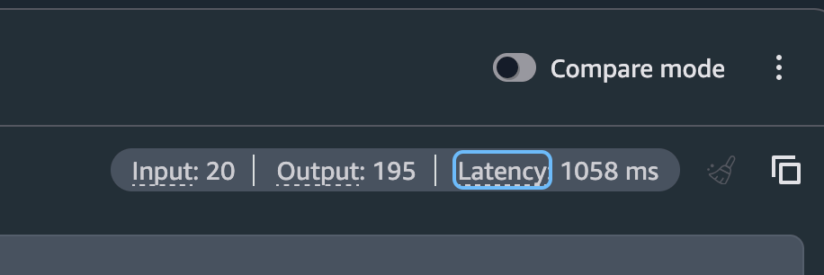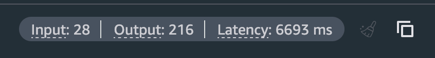 - I could also see relevant information such as the number of input and output tokens, as well as the latency, which is the time the foundation model took to generate each token.