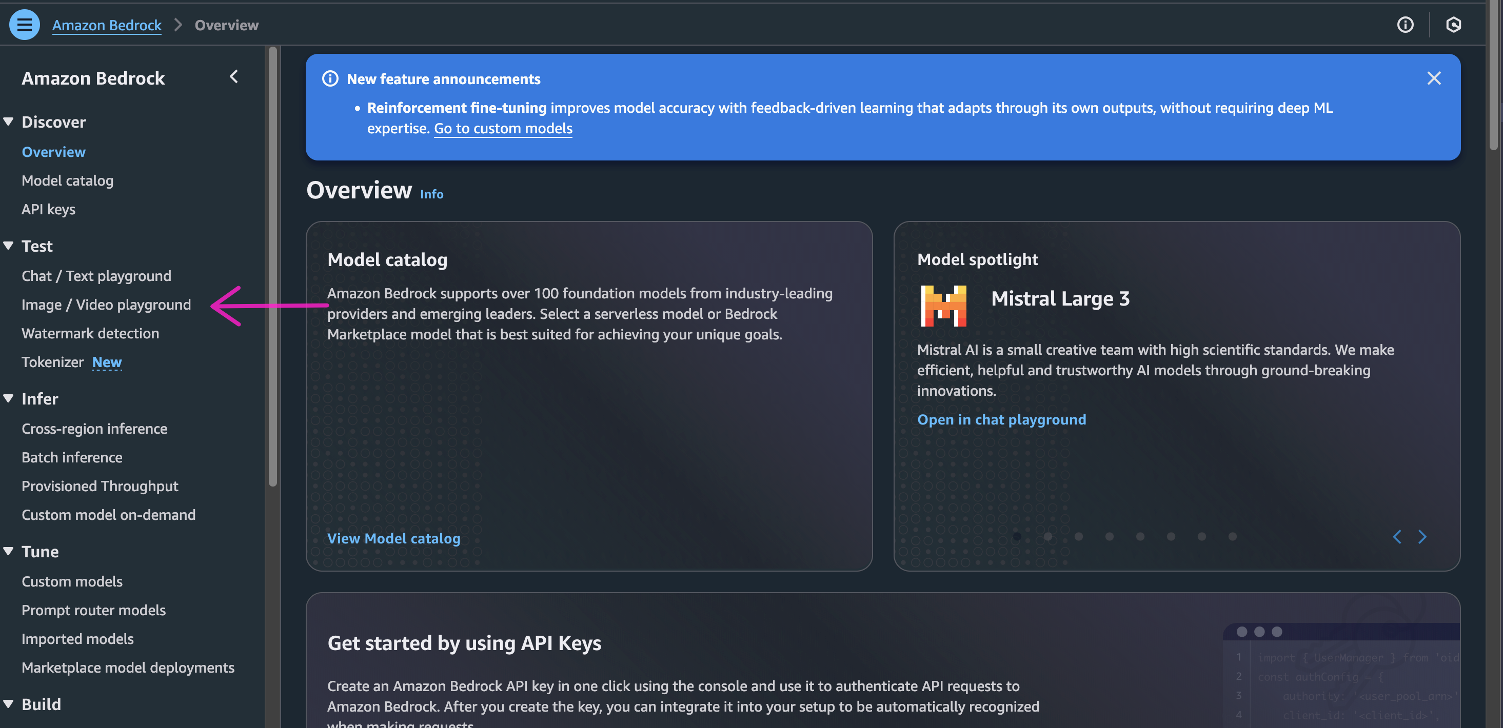 - Next, I tested image generation. For this, I returned to the main Amazon Bedrock console and selected Test > Image / Video playground
