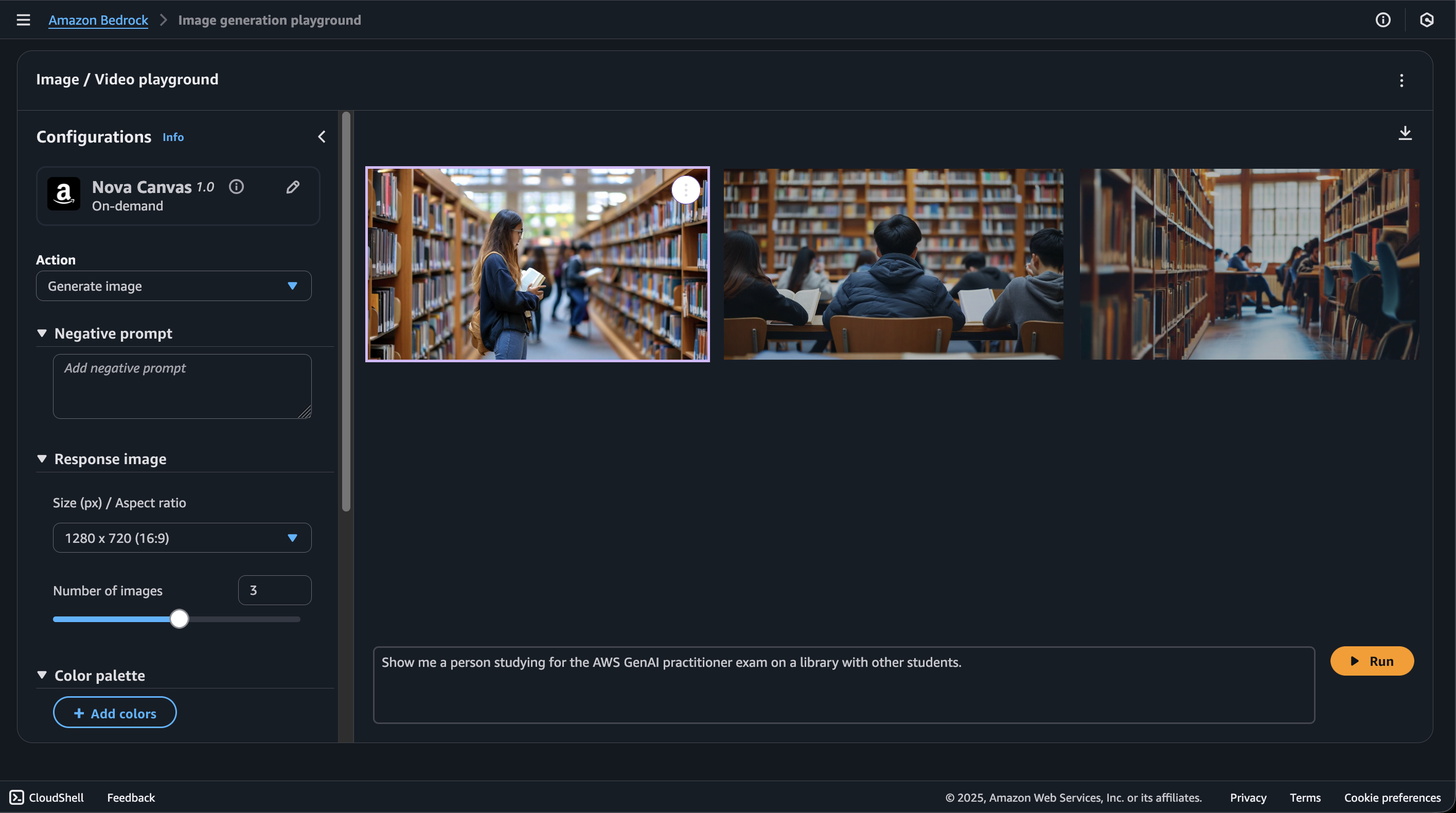 - I wrote the following prompt to experiment with the model: “Show me a person studying for the AWS GenAI practitioner exam on a library with other students.”,