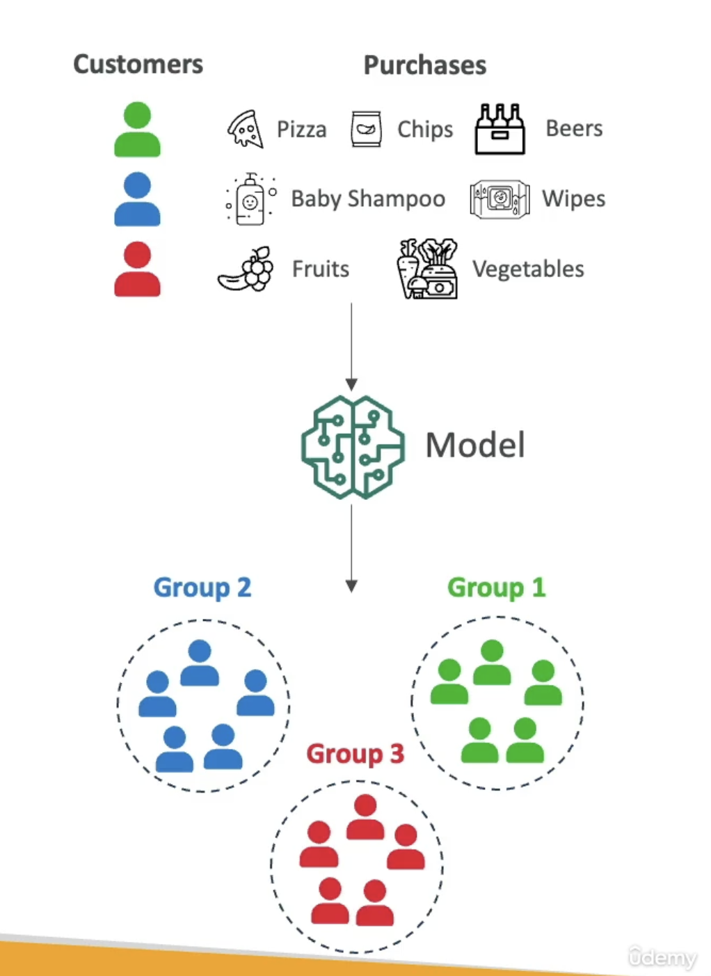The model plots all customers and identifies three distinct groups. The model does not know these are “students” or “new parents” — that interpretation comes from humans.